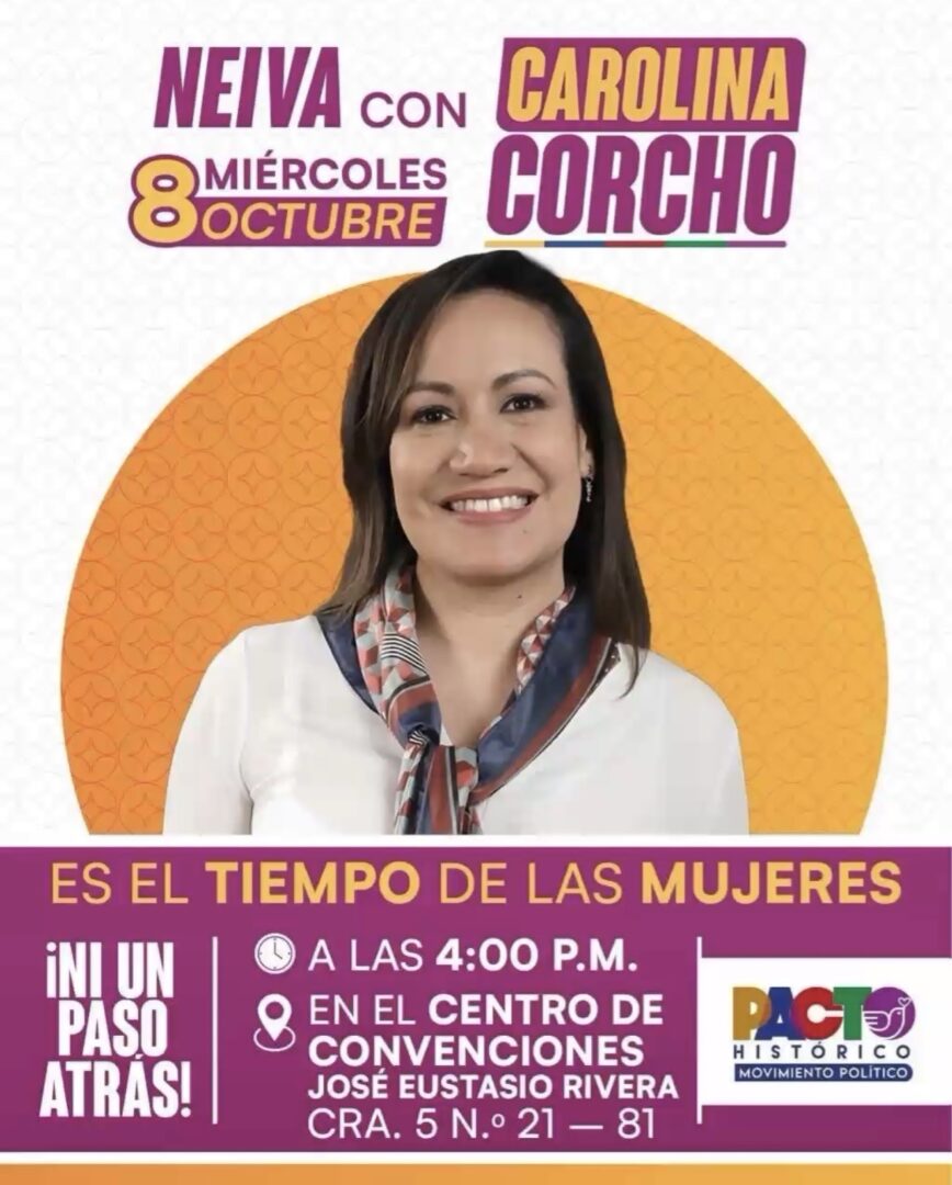 Corcho llega a la capital huilense con el lema “Es el tiempo de las mujeres”, mensaje con el que busca destacar el liderazgo femenino y la participación activa de la ciudadanía en la vida política del país.